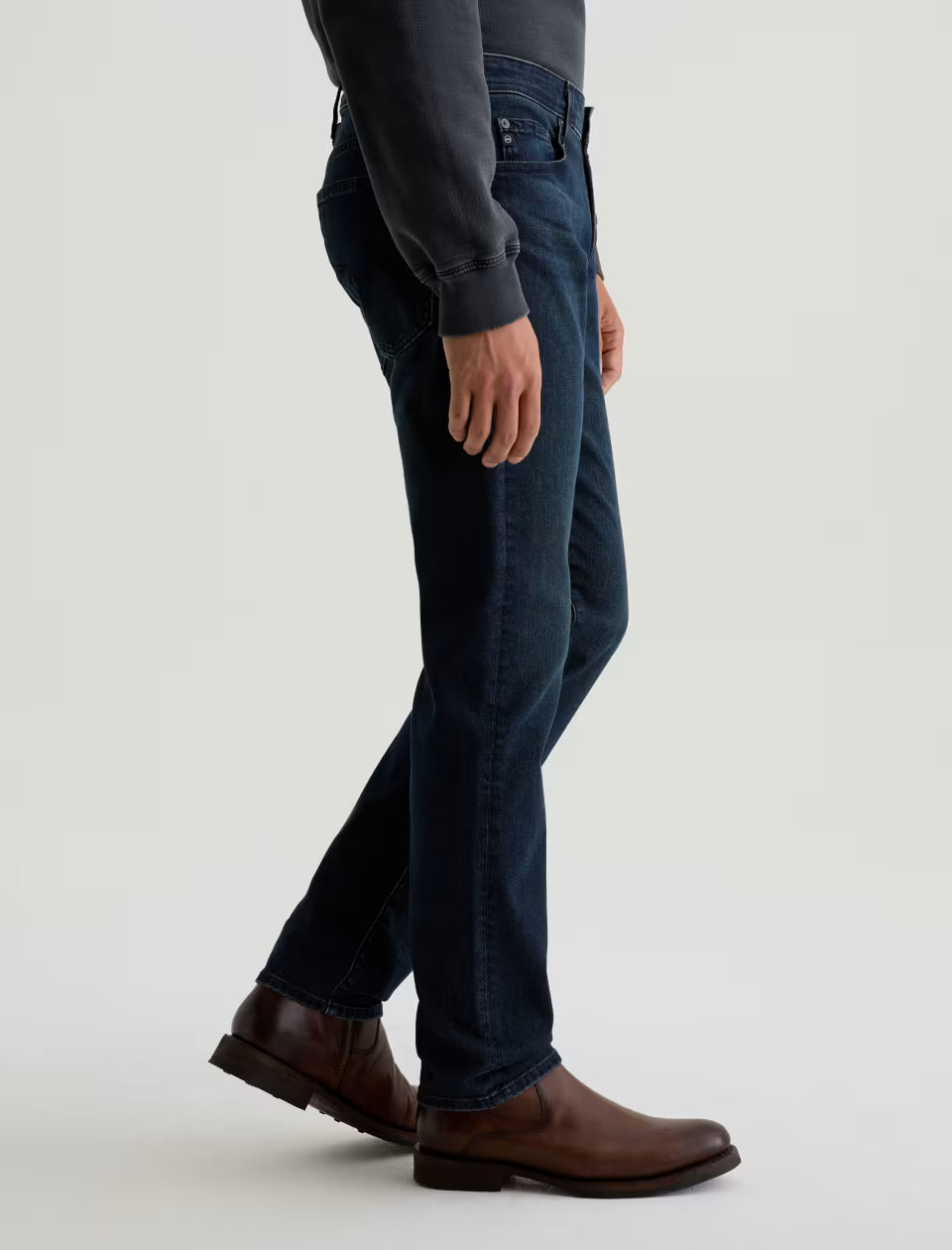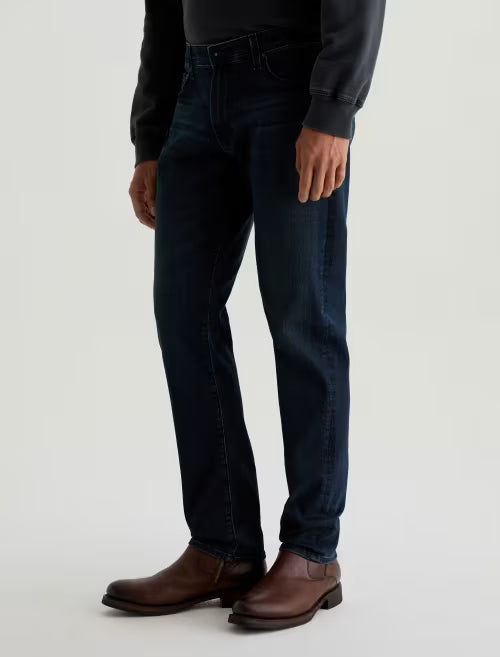 A nod to the open range, reimagined for today. Tellis is crafted in AG Cloud Soft Denim™, a special left-hand twill construction that gets softer with every wear. Our modern slim jean with a fitted upper block and tapered leg opening for a roomy fit. Designed with whiskering, light fading, and worn-down trim in our dark indigo wash, Bishop.