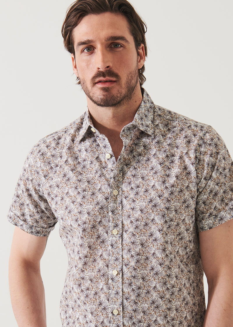 This floral print short sleeve button-up shirt is expertly crafted from a high quality Italian cotton fabric and patterned in elevated earth tones for a sophisticated appearance pair with your favorite linen pant to create a refined warm weather outfit.