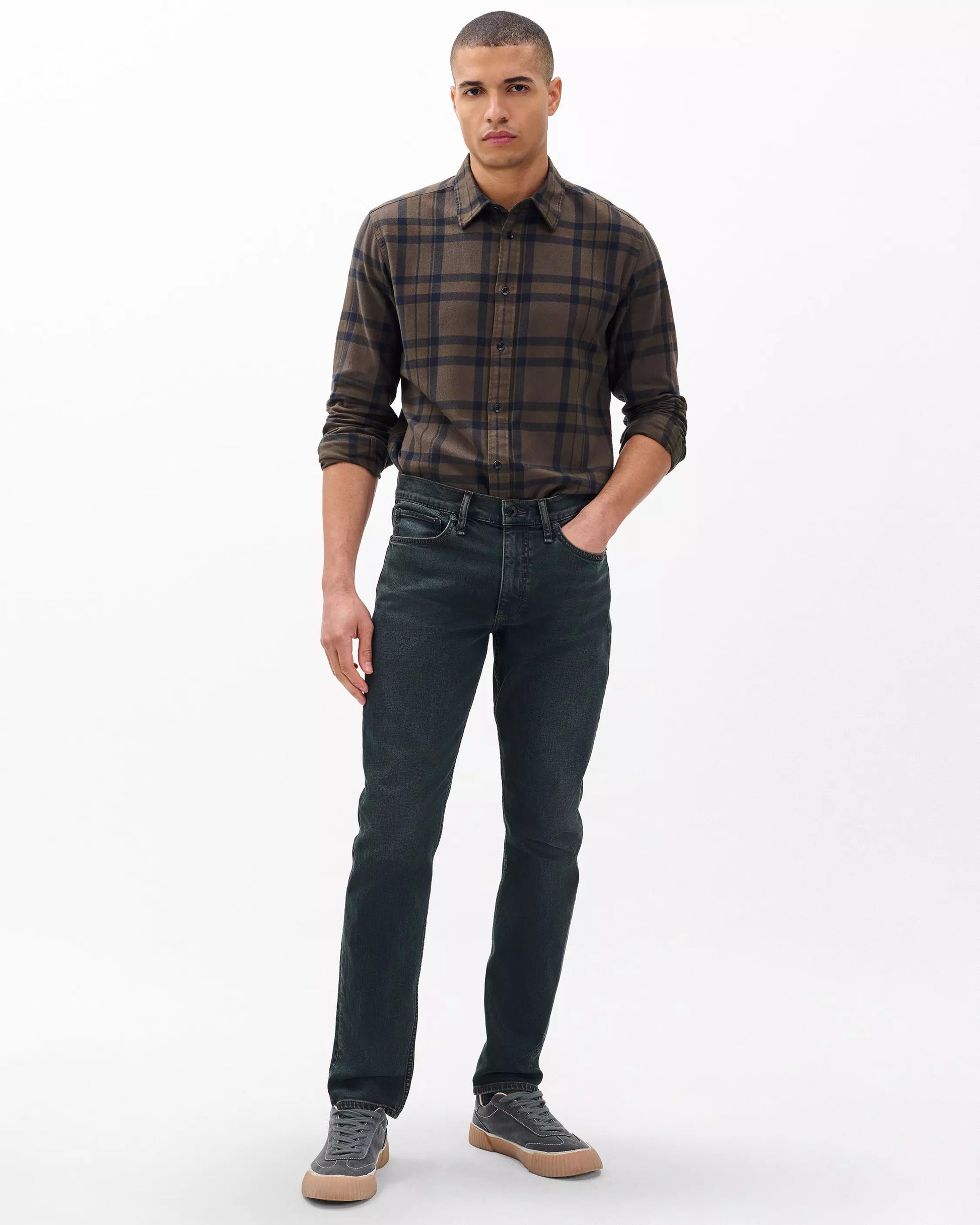 Authentic Stretch Denim in Infuse Oil Indigo, a custom-developed dark indigo wash with a black-brown overdye