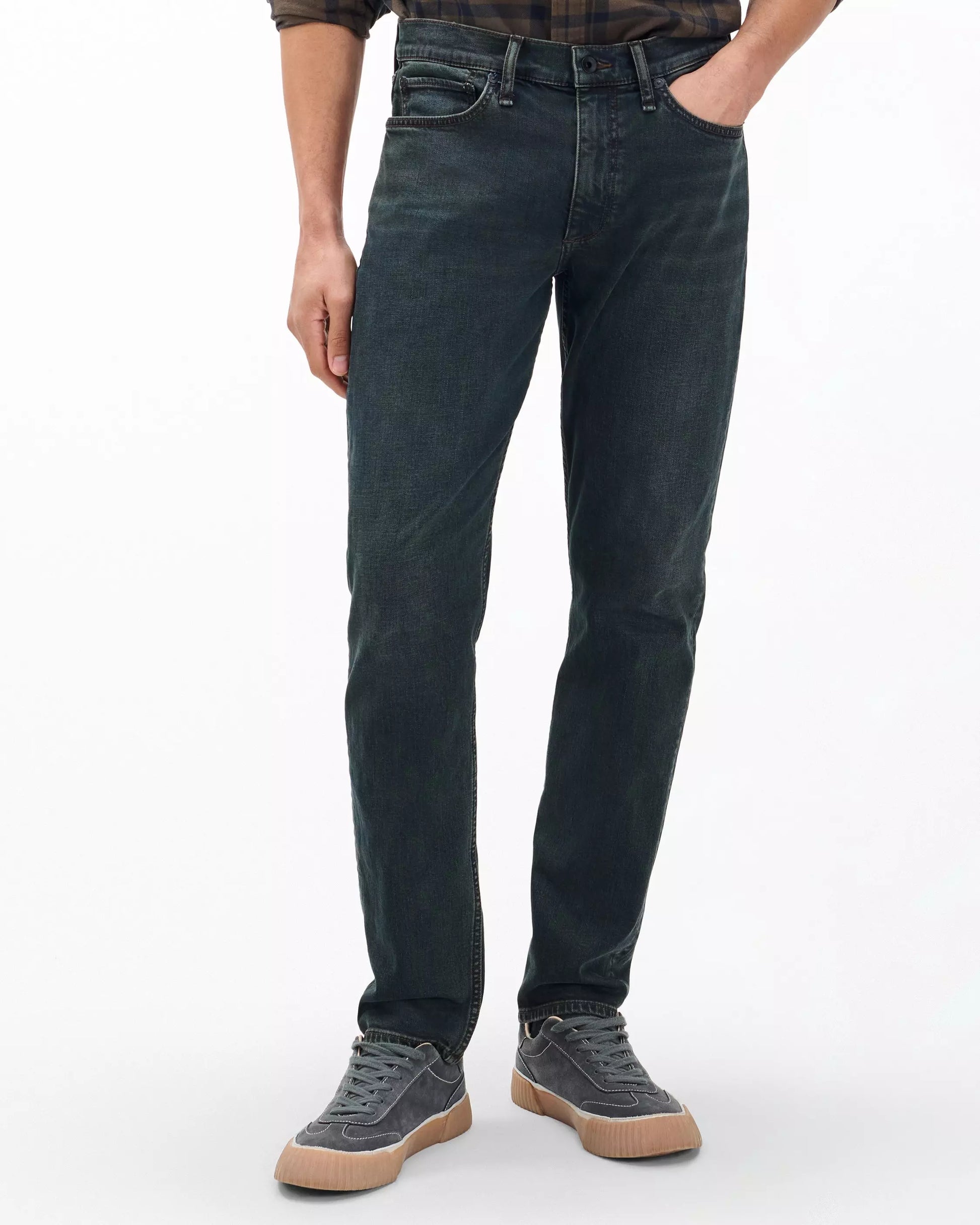 Fit 2. The most popular fit. Mid-rise, slim through the hip and thigh, with a tailored leg. Crafted from Authentic Stretch, a selvedge-inspired denim with an optimal touch of shape-holding stretch. In Infuse Oil Indigo, a custom-developed dark indigo wash with a black-brown overdye.