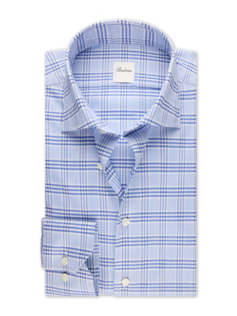 This checked twill shirt is made of cotton and is detailed with mother of pearl buttons, single cuffs and a cut away collar.